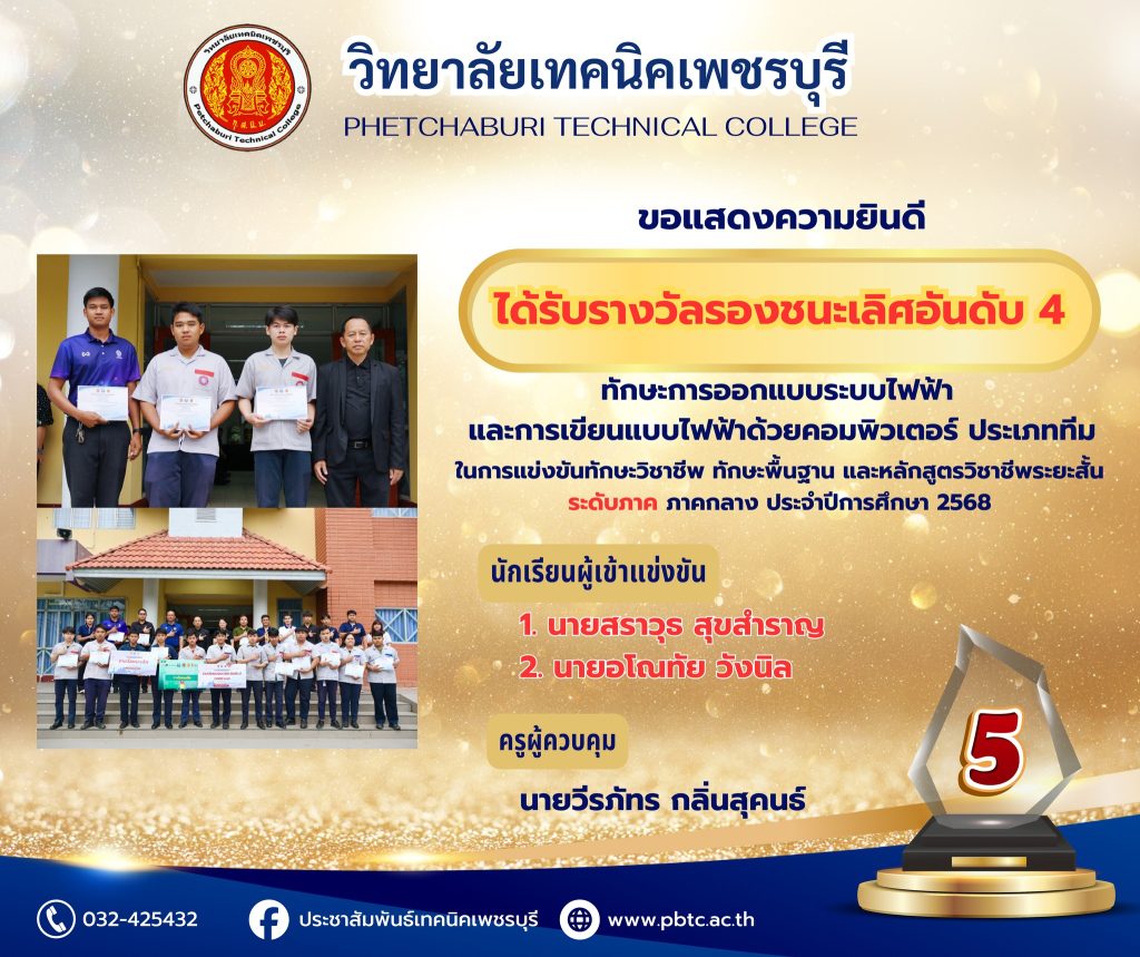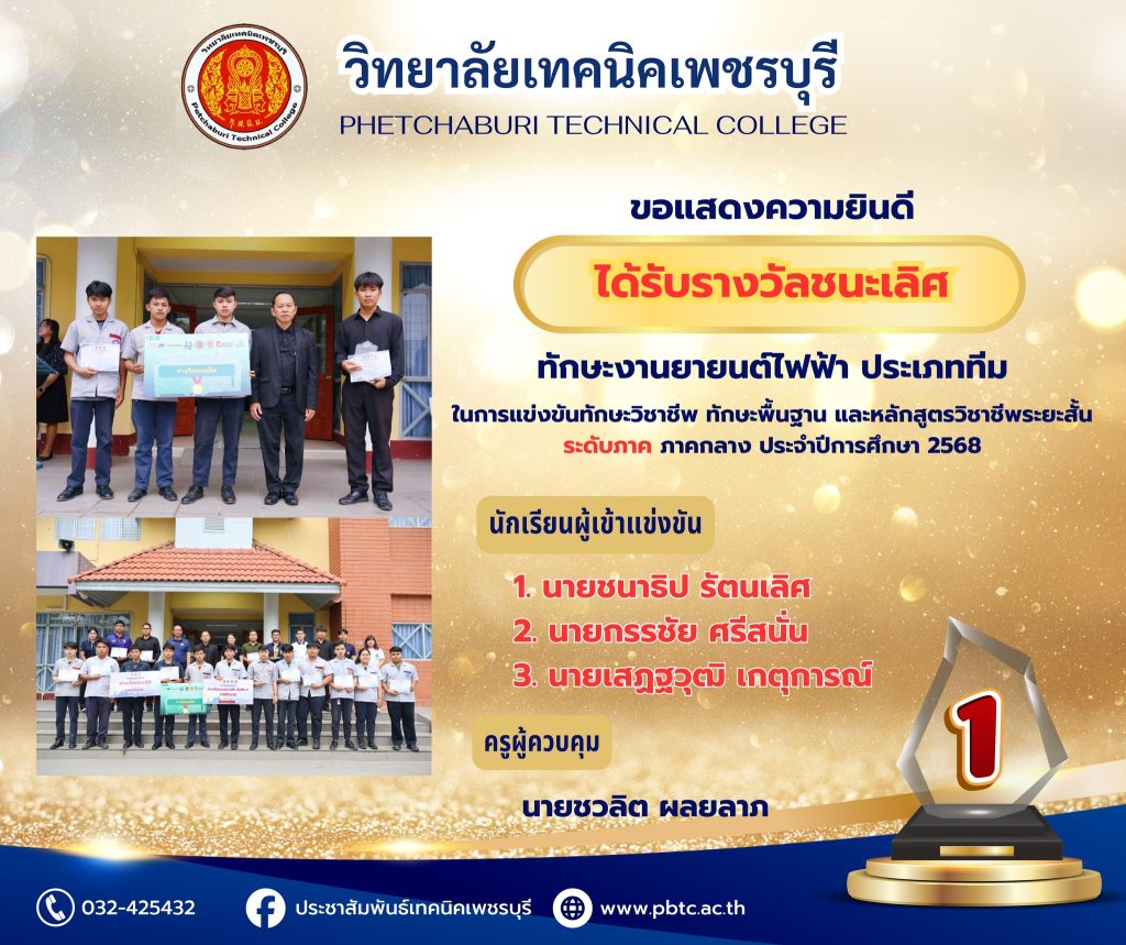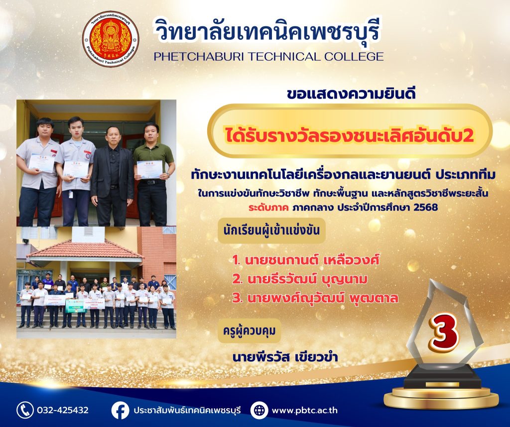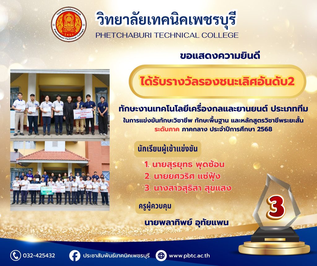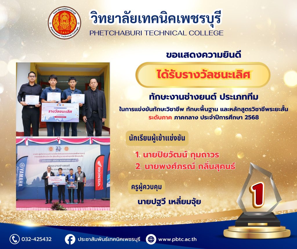 ข่าวประชาสัมพันธ์ ขอแสดงความยินดีวิทยาลัยเทคนิคเพชรบุรี ได้รับรางวัลชนะเลิศ🥇การแข่งขัน📍ทักษะงานช่างยนต์ ระดับ ปวช.ใน การแข่งขันทักษะวิชาชีพ และทักษะพื้นฐาน ระดับชาติ ครั้งที่ 34 ประจำปีการศึกษา 2568 ณ.วิทยาลัยเกษตรและเทคโนโลยีบุรีรัมย์ Bypbtc@Digitalcenter 13 กุมภาพันธ์ 20262 เมษายน 2026