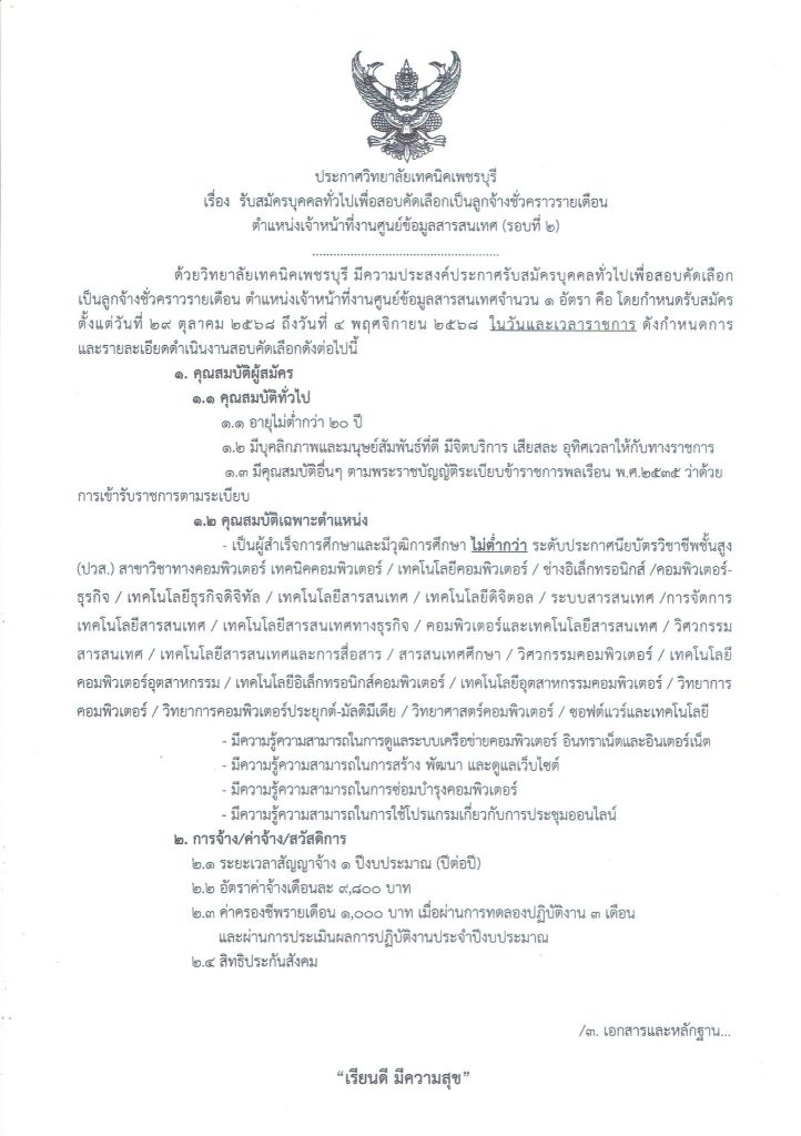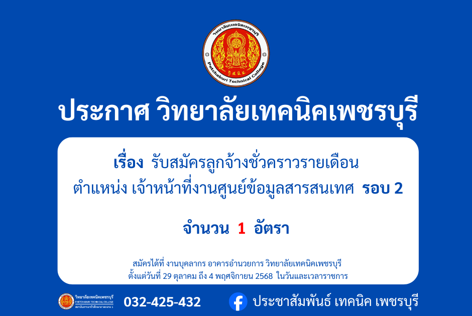 ข่าวจัดซื้อจัดจ้าง ประกาศ รับสมัครลูกจ้างชั่วคราวรายเดือน ตำแหน่งครูพิเศษสอน แผนกวิชาช่างก่อสร้าง Bypbtc@Digitalcenter 23 ธันวาคม 20252 เมษายน 2026