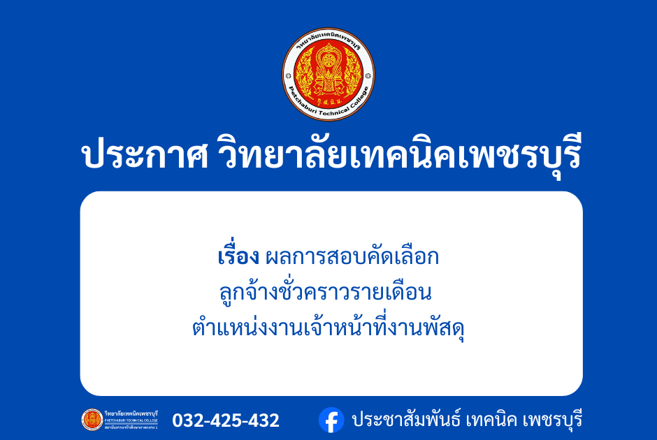 ข่าวจัดซื้อจัดจ้าง ประกาศ วิทยาลัยเทคนิคเพชรบุรี รายชื่อผู้มีสิทธิเข้ารับการประเมินสมรรถนะ ครั้งที่ 1 (สอบข้อเขียน) พนักงานราชการทั่วไป ตำแหน่ง พนักงานบริหารทั่วไป (ด้านพัสดุ) Bypbtc@Digitalcenter 3 เมษายน 20263 เมษายน 2026