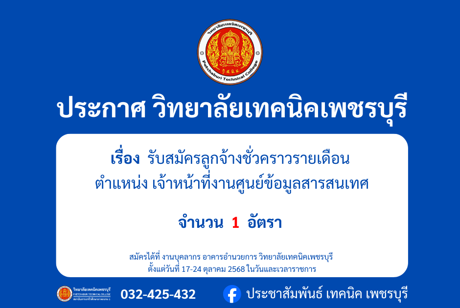 ข่าวจัดซื้อจัดจ้าง ประกาศรับสมัคร เจ้าหน้าที่งานศูนย์ข้อมูลสารสนเทศ รอบที่ 2 จำนวน 1 อัตรา Bypbtc@Digitalcenter 28 ตุลาคม 20251 เมษายน 2026
