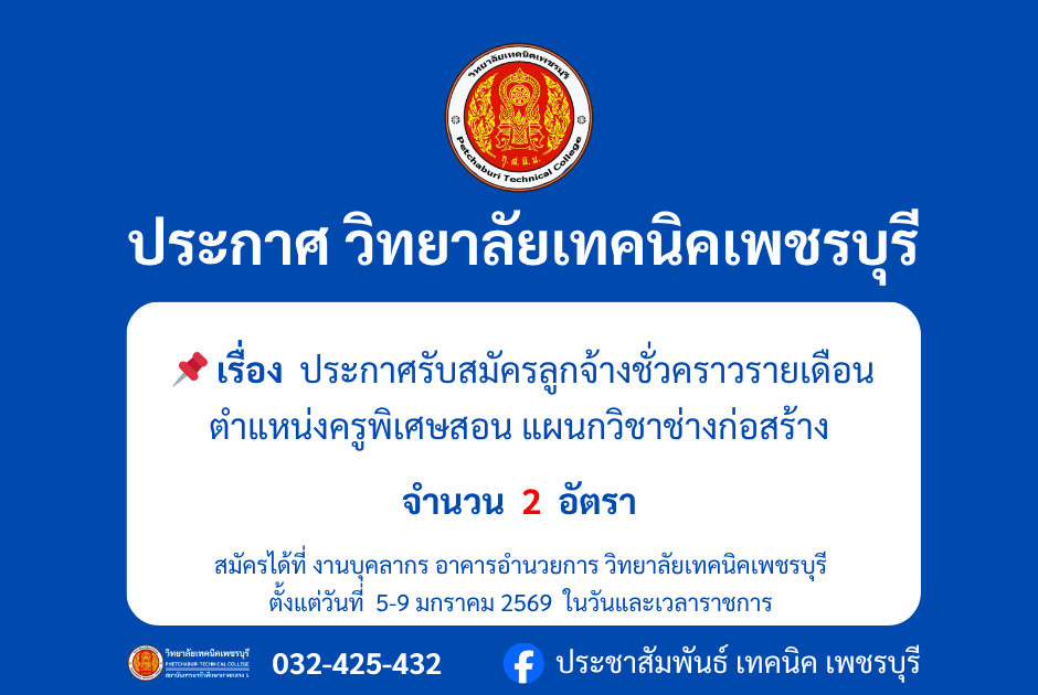ข่าวจัดซื้อจัดจ้าง ประกาศ วิทยาลัยเทคนิคเพชรบุรี รายชื่อผู้มีสิทธิเข้ารับการประเมินสมรรถนะ ครั้งที่ 1 (สอบข้อเขียน) พนักงานราชการทั่วไป ตำแหน่ง พนักงานบริหารทั่วไป (ด้านพัสดุ) Bypbtc@Digitalcenter 3 เมษายน 20263 เมษายน 2026