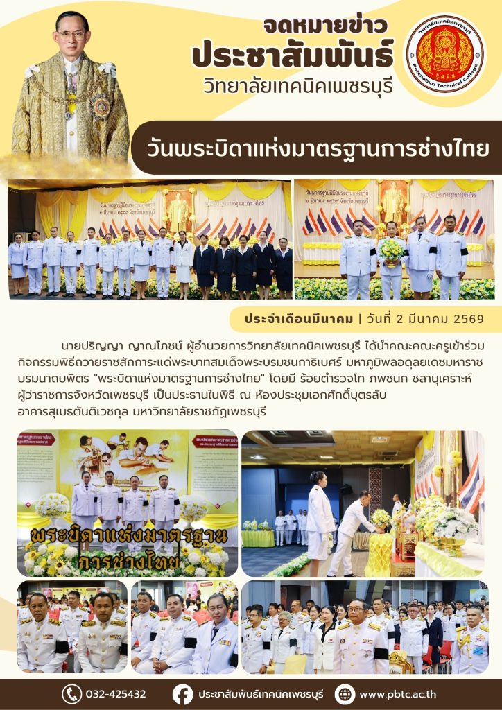 “วันพระบิดาแห่งมาตรฐานการช่างไทย” นายปริญญา ญาณโภชน์ ผู้อำนวยการวิทยาลัยเทคนิคเพชรบุรี ได้นำคณะคณะครูเข้าร่วมกิจกรรมพิธีถวายราชสักการะแด่พระบาทสมเด็จพระบรมชนกาธิเบศร์ มหาภูมิพลอดุลยเดชมหาราช บรมนาถบพิตร “พระบิดาแห่งมาตรฐานการช่างไทย” โดยมี ร้อยตำรวจโท ภพชนก ชลานุเคราะห์ ผู้ว่าราชการจังหวัดเพชรบุรี เป็นประธานในพิธี ณ ห้องประชุมเอกศักดิ์บุตรลับ อาคารสุเมธตันติเวชกุล มหาวิทยาลัยราชภัฏเพชรบุรี